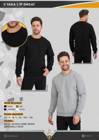 0 YAKA 3 İP SWEAT RENK SEÇENEĞİ SİYAH GRİ LACİVERT BEYAZ BEDEN SEÇENEĞİ XS - S - M - L - XL - XXL - 3XL GRAMAJ 320 Gr. 30/70/10 COMP. PENYE ŞARDONLU 3 İPLİK 3