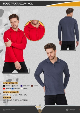 POLO YAKA UZUN KOL RENK SEÇENEĞİ SİYAH FÜME LACİVERT BORDO KIRMIZI SAX MAVİ BEYAZ BEDEN SEÇENEĞİ XS - S - M - L - XL - XXL - 3XL GRAMAJ 30/1 COMP. PİKE %100 PAMUK 200 Gr. 5