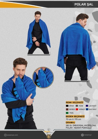 POLAR ŞAL RENK SEÇENEĞİ SİYAH FÜME LACİVERT BORDO KIRMIZI SAX MAVİ YEŞİL BEDEN SEÇENEĞİ 70 cm X 170 cm GRAMAJ 280 Gr. ÜNİVERSAL ANTİPİLLİNG POLAR - KENAR PÜSKÜLLÜ 6